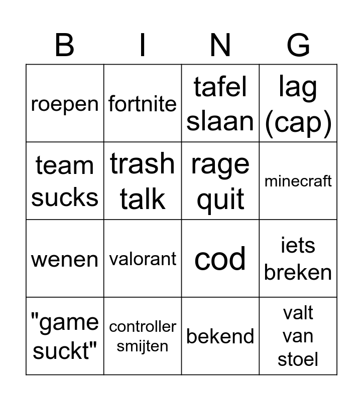This bingo card has 16 words: controller smijten, iets breken, tafel slaan, roepen, wenen, fortnite, cod, bekend, team sucks, trash talk, "game suckt", lag (cap), valorant, minecraft, rage quit and valt van stoel.
