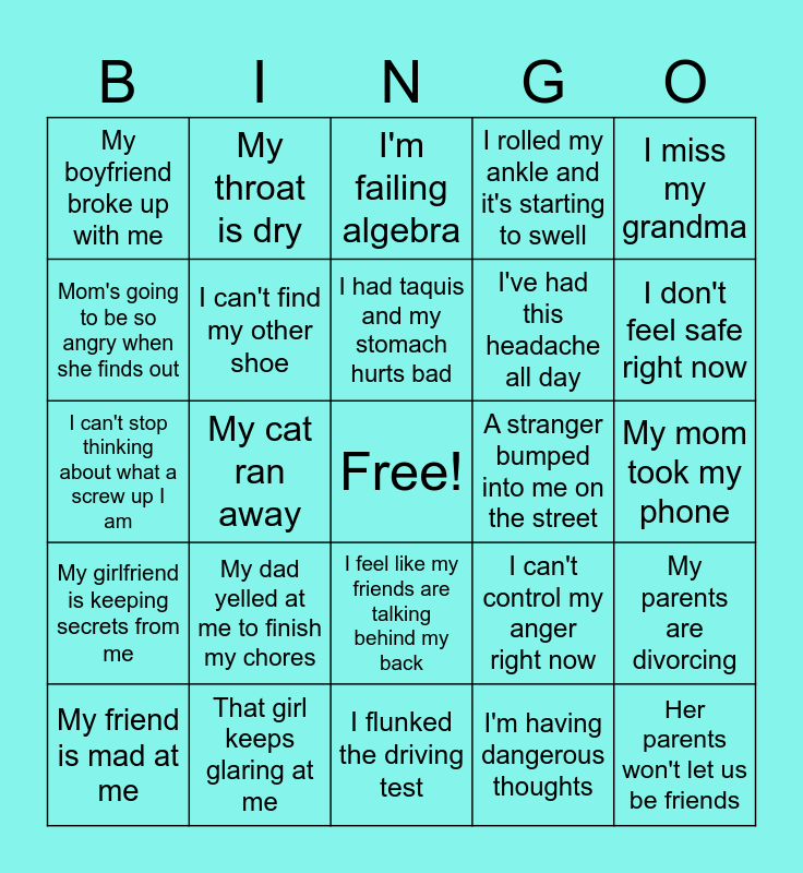 This bingo card has a free space and 29 words: My friend is mad at me, They didn't answer my call, My cat ran away, I didn't study for the test, My boyfriend broke up with me, I'm failing algebra, I can't find my other shoe, My dad yelled at me to finish my chores, A stranger bumped into me on the street, That girl keeps glaring at me, My mom took my phone, Her parents won't let us be friends, I flunked the driving test, I'm having dangerous thoughts, I don't feel safe right now, This situation is uncomfortable, I feel like my friends are talking behind my back, My girlfriend is keeping secrets from me, I miss my grandma, I can't stop thinking about what a screw up I am, I can't control my anger right now, I haven't eaten and now my stomach hurts, I've had this headache all day, Mom's going to be so angry when she finds out, I rolled my ankle and it's starting to swell, My throat is dry, My parents are divorcing, I had taquis and my stomach hurts bad and I've been in bed 10 minutes and can't sleep.