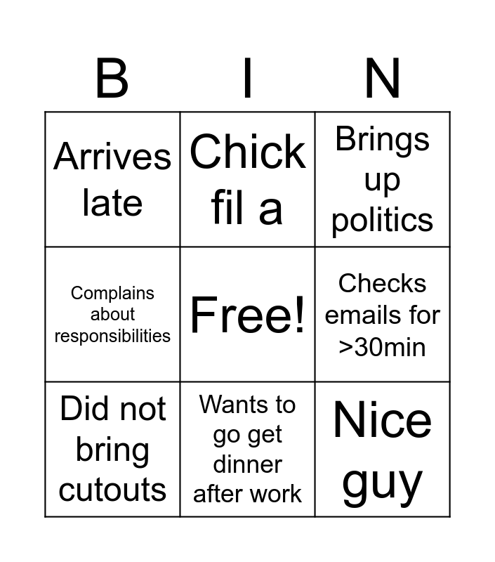 This bingo card has a free space and 9 words: Did not bring cutouts, Chick fil a, Checks emails for >30min, Arrives late, Brings up politics, Complains about responsibilities, Wants to go get dinner after work, Nice guy and Doesn’t bring harness.