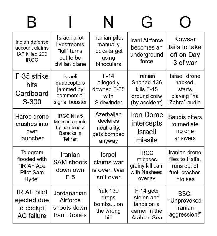 This bingo card has 25 words: Iranian SAM shoots down own F-5, Yak-130 drops bombs... on the wrong hill, F-14 allegedly downed F-35 with Sidewinder, IRIAF pilot ejected due to cockpit AC failure, Kowsar fails to take off on Day 3 of war, Indian defense account claims IAF killed 200 IRGC, F-35 strike hits Cardboard S-300, Israeli pilot livestreams "kill" turns out to be civilian plane, Iron Dome intercepts Israeli missile, Israel claims war is over. War isn’t over., Iranian Shahed-136 kills F-15 ground crew (by accident), Harop drone crashes into own launcher, IRGC releases grainy kill cam with Nasheed overlay, Iranian drone flies to Haifa, runs out of fuel, crashes into sea, Israeli quadcopters jammed by commercial signal booster, BBC: “Unprovoked Iranian aggression!”, Saudis offers to mediate no one answers, Iranian pilot manually locks target using binoculars, Israeli drone hacked, starts playing “Ya Zahra” audio, IRGC kills 5 Mossad agents by bombing a Baracks in Tehran, Azerbaijan declares neutrality, gets bombed anyway, Jordananian Airforce shoots down Irani Drones, Telegram flooded with "IRIAF Ace Pilot Sam Hyde", Irani Airforce becomes an underground force and F-14 gets stolen and lands on a carrier in the Arabian Sea.