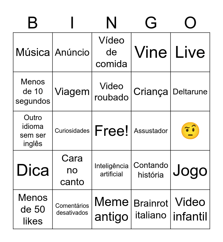 This bingo card has a free space and 24 words: Menos de 50 likes, Cara no canto, Video roubado, Brainrot italiano, Live, Música, Anúncio, Vídeo de comida, Assustador, 🤨, Outro idioma sem ser inglês, Viagem, Contando história, Jogo, Menos de 10 segundos, Comentários desativados, Meme antigo, Vine, Deltarune, Dica, Curiosidades, Inteligência artificial, Criança and Video infantil.