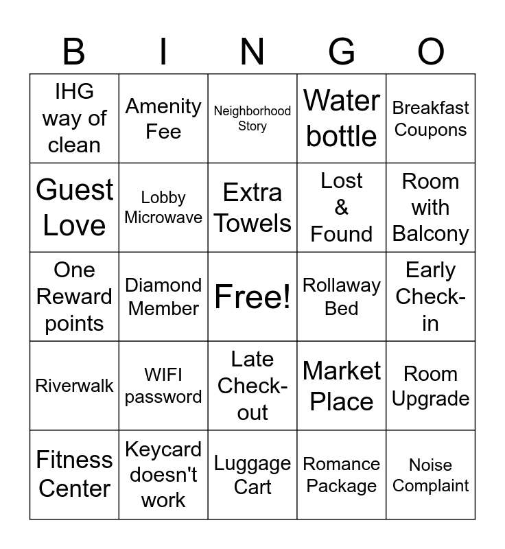 This bingo card has a free space and 24 words: WIFI password, Keycard doesn't work, Extra Towels, Fitness Center, Breakfast Coupons, IHG way of clean, Guest Love, Amenity Fee, Rollaway Bed, Late Check-out, Lost & Found, One Reward points, Market Place, Room Upgrade, Lobby Microwave, Romance Package, Early Check-in, Neighborhood Story, Room with Balcony, Diamond Member, Noise Complaint, Riverwalk, Water bottle and Luggage Cart.
