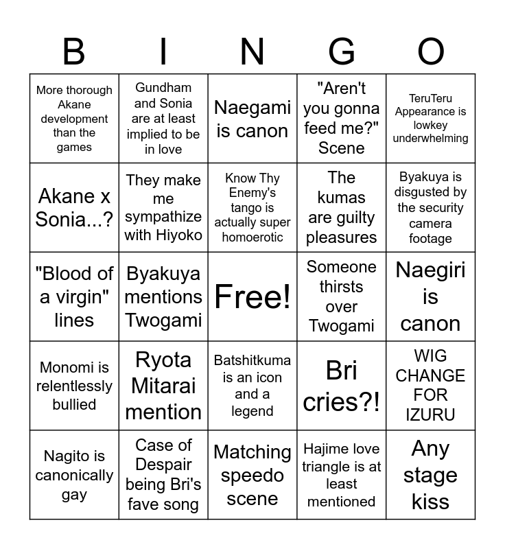 This bingo card has a free space and 24 words: Ryota Mitarai mention, Case of Despair being Bri's fave song, Know Thy Enemy's tango is actually super homoerotic, Nagito is canonically gay, TeruTeru Appearance is lowkey underwhelming, More thorough Akane development than the games, Akane x Sonia...?, Gundham and Sonia are at least implied to be in love, Someone thirsts over Twogami, Batshitkuma is an icon and a legend, The kumas are guilty pleasures, "Blood of a virgin" lines, Bri cries?!, WIG CHANGE FOR IZURU, They make me sympathize with Hiyoko, Hajime love triangle is at least mentioned, Naegiri is canon, Naegami is canon, Byakuya is disgusted by the security camera footage, Byakuya mentions Twogami, Any stage kiss, Monomi is relentlessly bullied, "Aren't you gonna feed me?" Scene and Matching speedo scene.