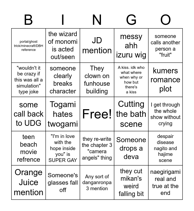 This bingo card has a free space and 24 words: "I'm in love with the hope inside you" is SUPER GAY, Someone's glasses fall off, They clown on funhouse building, Orange Juice mention, someone calls another person a "fruit", portal/ghost trick/minecraft/DBH reference, "wouldn't it be crazy if this was all a simulation" type joke, the wizard of monomi is acted out/seen, Cutting the bath scene, they re-write the chapter 3 "camera angels" thing, A kiss. idk who what where when why or how but there's a kiss, some call back to UDG, Someone drops a deva, despair disease nagito and hajime scene, someone clearly breaks character, they cut mikan's weird falling bit, I get through the whole show without crying, JD mention, kumers romance plot, Togami hates twogami, naegirigami real and true at the end, teen beach movie refrence, messy ahh izuru wig and Any sort of danganronpa 3 mention.