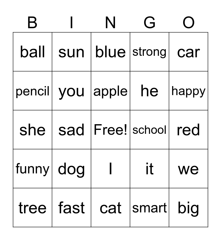 This bingo card has a free space and 25 words: dog, cat, apple, tree, car, ball, pencil, sun, school, I, he, she, it, we, you, they, red, blue, happy, sad, big, fast, funny, strong and smart.