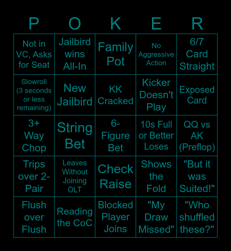 This bingo card has a free space and 74 words: Preflop Jam, Out-of-turn, Family Pot, Monotone Flop, Connected Flop, Only Broadway Flop, 4 Flush Board, 4 Straight Board, Flush over Flush, Straight over Straight, 72o Win, AA Cracked, KK Cracked, Slowroll (3 seconds or less remaining), "I shouldn't have folded, I had [XXy]", String Bet, Script Error, Exposed Card, Wrongly Awarded Pot, 3+ Way Chop, New Jailbird, Jailbird wins All-In, No Aggressive Action, Open Fold, "Who shuffled these?", Player Not-in-Hand Commentary, Hold & Fold, Preflop Raise Whining, Turned / Rivered Set, 3 Pair, 6/7 Card Straight, 6/7 Card Flush, Fuller House (3-2-2), 22 Wins, All-In First Hand, "My Draw Missed", Begging for a Rank/Suit During Action, "What a [Flop / Turn / River]", Bluff into Nuts, Yellow Card Awarded, Blocked Player Joins, Reading the CoC, Out-of-Time, OLT Discord Ad, Discord User can't Find RWC, Not in VC, Asks for Seat, Playing the Board, Leaves Without Joining OLT, TTS Jank, Donk Overbet, Troll Ban, AX vs AX, QQ vs AK (Preflop), Horrible Call, AA vs 72o (Preflop), Limp Reraise, Check Raise, Cold 5-Bet, Bust Ragequit, "But it was Suited!", Kicker Doesn't Play, Outkicked on 5th Card, Trips over 2-Pair, Double Trips, 10s Full or Better Loses, Tilt, Flush over Straight, Shows the Bluff, Shows the Fold, Consecutive Min Raises, Invalid Raise, 11+ Players, 5+ Waitlist and 2+ Seats Busted.