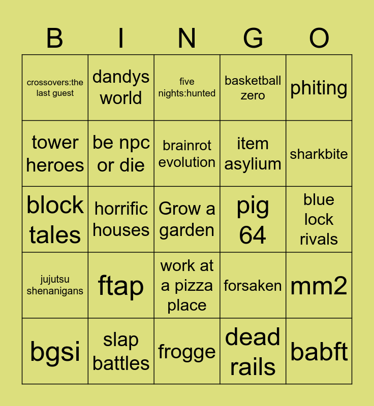 This bingo card has a free space and 24 words: ftap, slap battles, brainrot evolution, bgsi, phiting, crossovers:the last guest, tower heroes, dandys world, pig 64, work at a pizza place, item asylium, block tales, forsaken, mm2, be npc or die, dead rails, blue lock rivals, five nights:hunted, sharkbite, horrific houses, babft, jujutsu shenanigans, basketball zero and frogge.