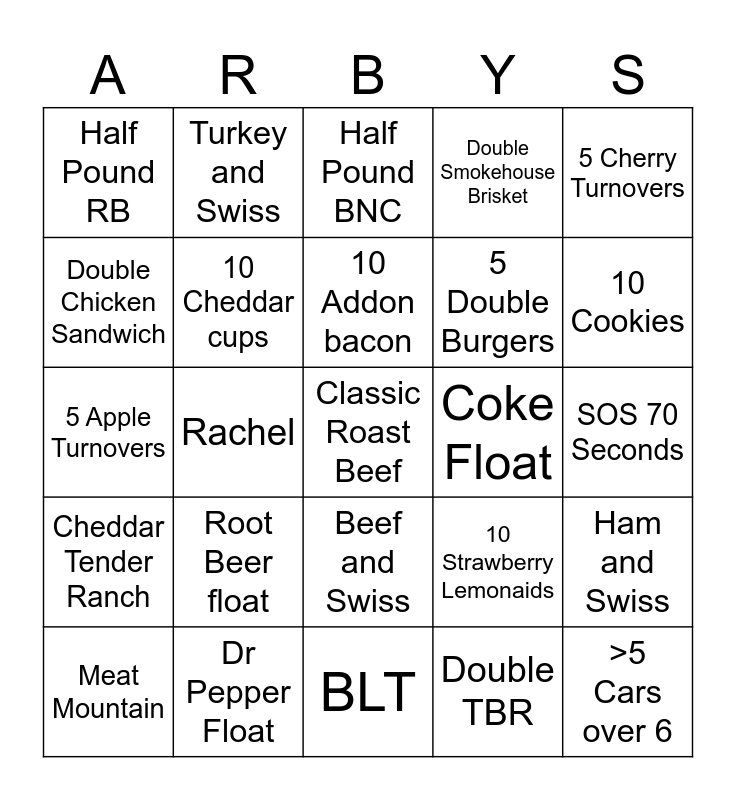 This bingo card has a free space and 29 words: Meat Mountain, Double Ruben, Rachel, Half Pound French Dip, Half Pound RB, Half Pound BNC, 10 Cheddar cups, Root Beer float, Coke Float, Dr Pepper Float, SOS 70 Seconds, >5 Cars over 6, BLT, Double TBR, 10 Cookies, Super RB, Beef and Swiss, Cheddar Tender Ranch, 5 Cherry Turnovers, 5 Apple Turnovers, 10 Strawberry Lemonaids, Loaf of bread, 5 Double Burgers, Double Chicken Sandwich, Double Smokehouse Brisket, Turkey and Swiss, Ham and Swiss, 10 Addon bacon and Double Gyro.