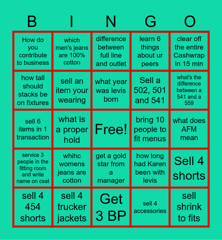 This bingo card has a free space and 24 words: sell 4 454 shorts, whihc womens jeans are cotton, what year was levis born, sell 4 accessories, clear off the entire Cashwrap in 15 min, How do you contribute to business, which men's jeans are 100% cotton, difference between full line and outlet, bring 10 people to fit menus, what does AFM mean, sell 6 items in 1 transaction, sell an item your wearing, how long had Karen been with levis, Sell 4 shorts, how tall should stacks be on fixtures, sell 4 trucker jackets, Get 3 BP, learn 6 things about ur peers, what's the difference between a 541 and a 559, service 3 people in the fitting room and write name on csat, what is a proper hold, get a gold star from a manager, Sell a 502, 501 and 541 and sell shrink to fits.