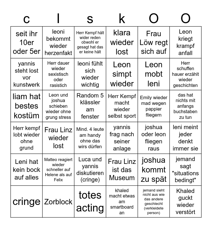 This bingo card has 36 words: Frau Linz ist das Museum, Luca und yannis diskutieren (cringe), khaled macht etwas am smartboard an, yannis steht lost vor kunstwerk, Herr kempf lobt wieder ohne grund, Herr Kempf macht wieder selbst sport, Herr dauer wieder sexistisch oder rasistich, totes acting, Frau Löw regt sich auf, joshua kommt zu spät, Herr schuffen hauer erzählt wieder geschichten, klara wieder lost, jemand sagt "situations bedingt", Leon und joshua schieben wieder ohne grung stress, Leon simpt wieder, seit ihr 10er oder 5er, Leni hat kein bock auf alles, Emily wieder mad wegen pappier fliegern, liam hat bestes kostüm, Herr Kempf hält wider reden obwohl er gesagt hat das er keine hält, Random 5 klässler am fenster, Frau Linz wieder lost, yannis frag nach seiner anlage, Mind. 4 leute am handy ohne das wirs dürfen, joshua oder leon fliegen raus, leoni bekommt wieder herzenfakt, Leon mobt leni, Zorblock, leoni fühlt sich wieder wichtig, Leon kriegt krampf anfall, Khaled guckt wieder verstört, cringe, leni meint jeder denkt immer sie, das hat nichts mit anfangs buchstaben zu tun, Matteo reagiert wieder schneller auf Helene als auf Felix and jemand sieht nicht aus wie das andere geschlecht (verkleidete person).
