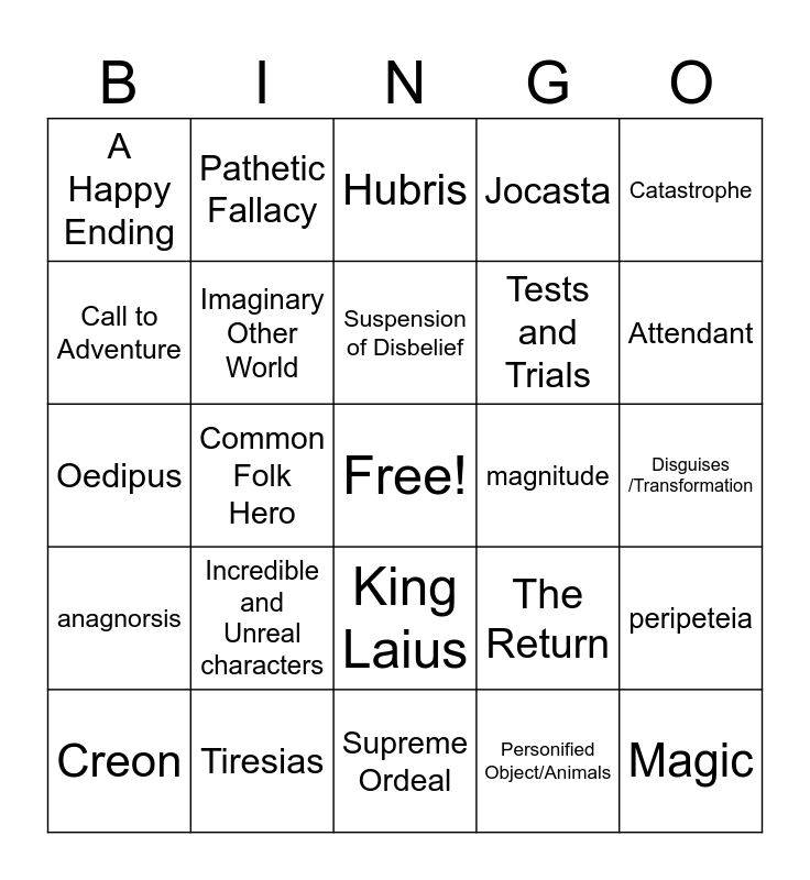 This bingo card has a free space and 27 words: The Return, Separation, Tests and Trials, Supreme Ordeal, Call to Adventure, Hubris, Pathetic Fallacy, anagnorsis, magnitude, peripeteia, Oedipus, Jocasta, Creon, Tiresias, Attendant, Chorus, Imaginary Other World, Suspension of Disbelief, Incredible and Unreal characters, A Happy Ending, Disguises /Transformation, Personified Object/Animals, Common Folk Hero, Magic, King Laius, Catastrophe and Hamartia.