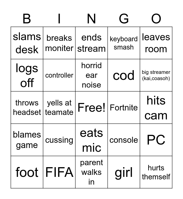 This bingo card has a free space and 24 words: foot, cussing, horrid ear noise, girl, leaves room, slams desk, breaks moniter, ends stream, Fortnite, hits cam, throws headset, controller, console, PC, logs off, FIFA, parent walks in, keyboard smash, big streamer (kai,coasoh), blames game, yells at teamate, eats mic, cod and hurts themself.