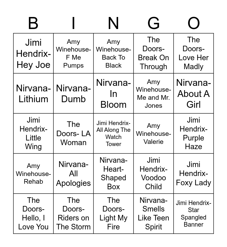 This bingo card has 28 words: Jimi Hendrix- Foxy Lady, The Doors- People Are Strange, Amy Winehouse- Me and Mr. Jones, Nirvana- Smells Like Teen Spirit, Nirvana- Lithium, Amy Winehouse- Back To Black, Amy Winehouse- F Me Pumps, Amy Winehouse- Rehab, Amy Winehouse- Valerie, The Doors- Hello, I Love You, Jimi Hendrix- Little Wing, The Doors- Break On Through, The Doors- Riders on The Storm, The Doors- Light My Fire, Nirvana- About A Girl, Nirvana- Where Did You Sleep Last Night?, Nirvana- All Apologies, Nirvana- Dumb, Nirvana- In Bloom, Nirvana- Heart-Shaped Box, Jimi Hendrix- Hey Joe, Jimi Hendrix- Star Spangled Banner, Jimi Hendrix- All Along The Watch Tower, The Doors- LA Woman, Jimi Hendrix- Purple Haze, Jimi Hendrix- Voodoo Child, The Doors- Love Her Madly and The Doors- Back Door Man.