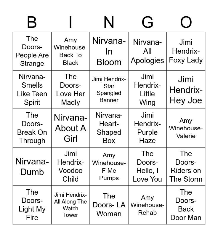 This bingo card has 26 words: Amy Winehouse- F Me Pumps, Amy Winehouse- Rehab, Jimi Hendrix- Star Spangled Banner, Jimi Hendrix- All Along The Watch Tower, Jimi Hendrix- Foxy Lady, The Doors- People Are Strange, Nirvana- Smells Like Teen Spirit, Amy Winehouse- Back To Black, Amy Winehouse- Valerie, The Doors- Hello, I Love You, Jimi Hendrix- Little Wing, The Doors- Break On Through, The Doors- Riders on The Storm, The Doors- Light My Fire, Nirvana- About A Girl, Nirvana- Where Did You Sleep Last Night?, Nirvana- All Apologies, Nirvana- Dumb, Nirvana- In Bloom, Nirvana- Heart-Shaped Box, Jimi Hendrix- Hey Joe, The Doors- LA Woman, Jimi Hendrix- Purple Haze, Jimi Hendrix- Voodoo Child, The Doors- Love Her Madly and The Doors- Back Door Man.