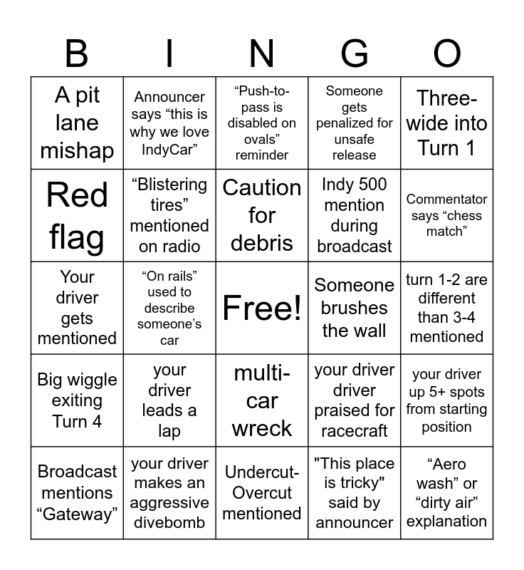 This bingo card has a free space and 24 words: your driver leads a lap, your driver makes an aggressive divebomb, Caution for debris, Broadcast mentions “Gateway”, Three-wide into Turn 1, A pit lane mishap, Red flag, Announcer says “this is why we love IndyCar”, Someone brushes the wall, multi-car wreck, Indy 500 mention during broadcast, Your driver gets mentioned, your driver driver praised for racecraft, your driver up 5+ spots from starting position, “Blistering tires” mentioned on radio, "This place is tricky" said by announcer, turn 1-2 are different than 3-4 mentioned, “Push-to-pass is disabled on ovals” reminder, Commentator says “chess match”, “On rails” used to describe someone’s car, “Aero wash” or “dirty air” explanation, Big wiggle exiting Turn 4, Someone gets penalized for unsafe release and Undercut-Overcut mentioned.