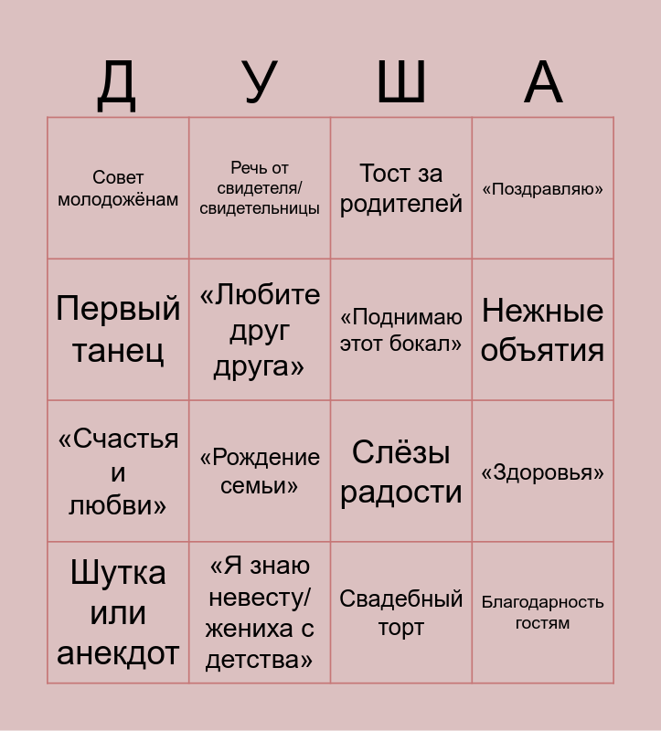 This bingo card has 16 words: «Я знаю невесту/жениха с детства», «Здоровья», Тост за родителей, Совет молодожёнам, «Счастья и любви», Речь от свидетеля/свидетельницы, Слёзы радости, Свадебный торт, Первый танец, «Любите друг друга», Шутка или анекдот, «Поздравляю», «Рождение семьи», Нежные объятия, «Поднимаю этот бокал» and Благодарность гостям.