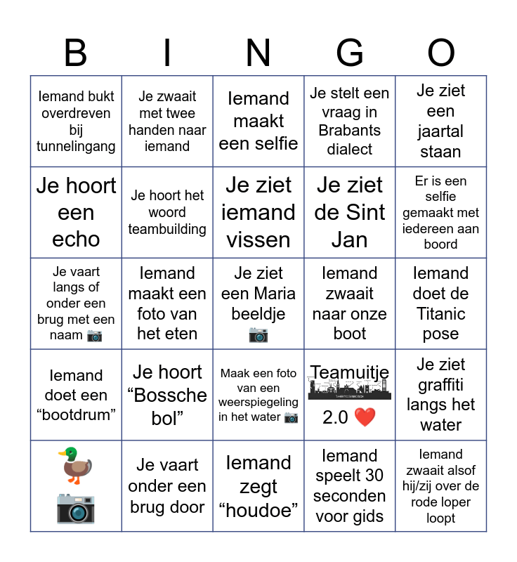 This bingo card has 1 images and 25 words: Je hoort “Bossche bol”, Iemand zegt “houdoe”, Je ziet iemand vissen, 🦆📷, Je ziet een jaartal staan, Iemand bukt overdreven bij tunnelingang, Je hoort een echo, Je zwaait met twee handen naar iemand, Iemand zwaait naar onze boot, Maak een foto van een weerspiegeling in het water 📷, Je ziet de Sint Jan, Je vaart langs of onder een brug met een naam 📷, Teamuitje 2.0 ❤️, Je ziet graffiti langs het water, Je hoort het woord teambuilding, Iemand zwaait alsof hij/zij over de rode loper loopt, Iemand doet de Titanic pose, Iemand maakt een selfie, Er is een selfie gemaakt met iedereen aan boord, Iemand maakt een foto van het eten, Je ziet een Maria beeldje 📷, Je vaart onder een brug door, Iemand doet een “bootdrum”, Je stelt een vraag in Brabants dialect and Iemand speelt 30 seconden voor gids.