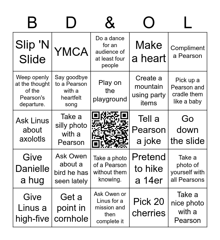 This bingo card has a free space and 29 words: Give Linus a high-five, Give Ben a hug, Take a silly photo with a Pearson, Run a lap around the park., Slip 'N Slide, Do a dance for an audience of at least four people, Say goodbye to a Pearson with a heartfelt song, Ask Owen about a bird he has seen lately, Tell a Pearson a joke, Get a point in cornhole, Go down the slide, Take a nice photo with a Pearson, Ask Owen or Linus for a mission and then complete it, Pick 20 cherries, Pick up a Pearson and cradle them like a baby, Get Danielle to reveal the location of a hidden paper in Laura and Tim's home., Take a photo of a Pearson without them knowing., Give Danielle a hug, Compliment a Pearson, Ask Linus about axolotls, Pretend to hike a 14er, Give Owen a high-five, Create a mountain using party items, Weep openly at the thought of the Pearson's departure., Make a heart, YMCA, Take a photo of yourself with all Pearsons, Play on the playground and Human wheelbarrow.