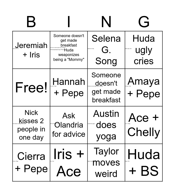 This bingo card has 15 images and 16 words: Iris + Ace, Ace + Chelly, Selena G. Song, Jeremiah + Iris, Nick kisses 2 people in one day, Someone doesn't get made breakfast Huda weaponizes being a "Mommy", Austin does yoga, Taylor moves weird, Free!, Hannah + Pepe, Cierra + Pepe, Huda ugly cries, Ask Olandria for advice, Amaya + Pepe, Someone doesn't get made breakfast and Huda + BS.
