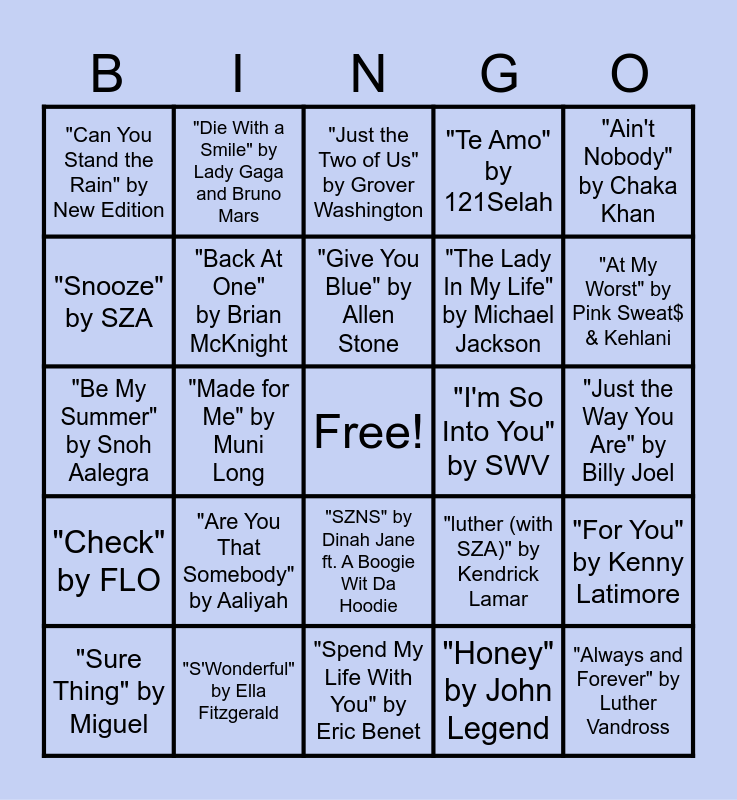 This bingo card has a free space and 29 words: "Sure Thing" by Miguel, "And Then" by James Tillman, "Made for Me" by Muni Long, "Knocks Me Off My Feet" by Stevie Wonder, "Can You Stand the Rain" by New Edition, "Just the Two of Us" by Grover Washington, "Back At One" by Brian McKnight, "Are You That Somebody" by Aaliyah, "I'm So Into You" by SWV, "S'Wonderful" by Ella Fitzgerald, "Just the Way You Are" by Billy Joel, "Always and Forever" by Luther Vandross, "Spend My Life With You" by Eric Benet, "Honey" by John Legend, "At My Worst" by Pink Sweat$ & Kehlani, "Heaven On Earth" by Roann, ft. Jordan Hawkins, "SZNS" by Dinah Jane ft. A Boogie Wit Da Hoodie, "Check" by FLO, "Ain't Nobody" by Chaka Khan, "Be My Summer" by Snoh Aalegra, "luther (with SZA)" by Kendrick Lamar, "Love Me In a Special Way" by Debarge, "The Lady In My Life" by Michael Jackson, "Snooze" by SZA, "Te Amo" by 121Selah, "Die With a Smile" by Lady Gaga and Bruno Mars, "For You" by Kenny Latimore, "Give You Blue" by Allen Stone and "P.Y.T (Pretty Young Thing)" by Michael Jackson.