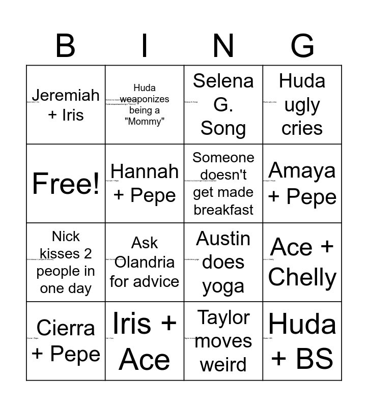 This bingo card has 15 images and 16 words: Iris + Ace, Ace + Chelly, Selena G. Song, Jeremiah + Iris, Nick kisses 2 people in one day, Huda weaponizes being a "Mommy", Austin does yoga, Taylor moves weird, Free!, Hannah + Pepe, Cierra + Pepe, Huda ugly cries, Ask Olandria for advice, Amaya + Pepe, Someone doesn't get made breakfast and Huda + BS.