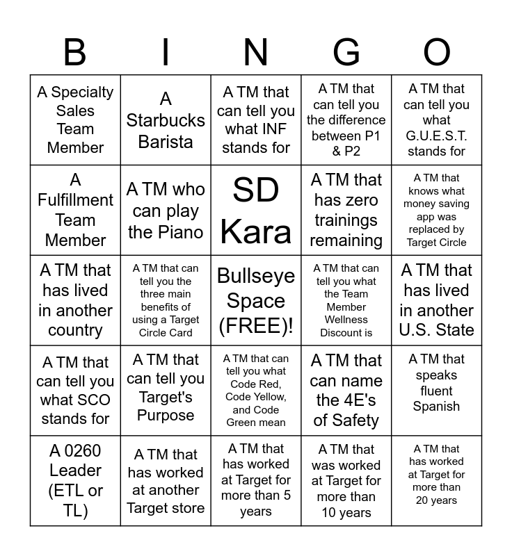 This bingo card has a free space and 24 words: A TM that can tell you Target's Purpose, A TM that has worked at another Target store, SD Kara, A 0260 Leader (ETL or TL), A TM that can tell you what G.U.E.S.T. stands for, A Specialty Sales Team Member, A Fulfillment Team Member, A Starbucks Barista, A TM that can tell you what the Team Member Wellness Discount is, A TM that can tell you what Code Red, Code Yellow, and Code Green mean, A TM that has zero trainings remaining, A TM that has lived in another country, A TM that can name the 4E's of Safety, A TM that speaks fluent Spanish, A TM who can play the Piano, A TM that was worked at Target for more than 10 years, A TM that has lived in another U.S. State, A TM that can tell you what INF stands for, A TM that knows what money saving app was replaced by Target Circle, A TM that can tell you the three main benefits of using a Target Circle Card, A TM that has worked at Target for more than 20 years, A TM that can tell you what SCO stands for, A TM that can tell you the difference between P1 & P2 and A TM that has worked at Target for more than 5 years.