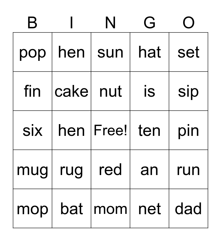 This bingo card has a free space and 29 words: mop, can, hen, mat, pop, sun, cake, rug, ten, bat, pin, dad, mom, net, sip, tan, red, mug, set, six, an, am, is, fin, hat, hen, run, nut and rat.