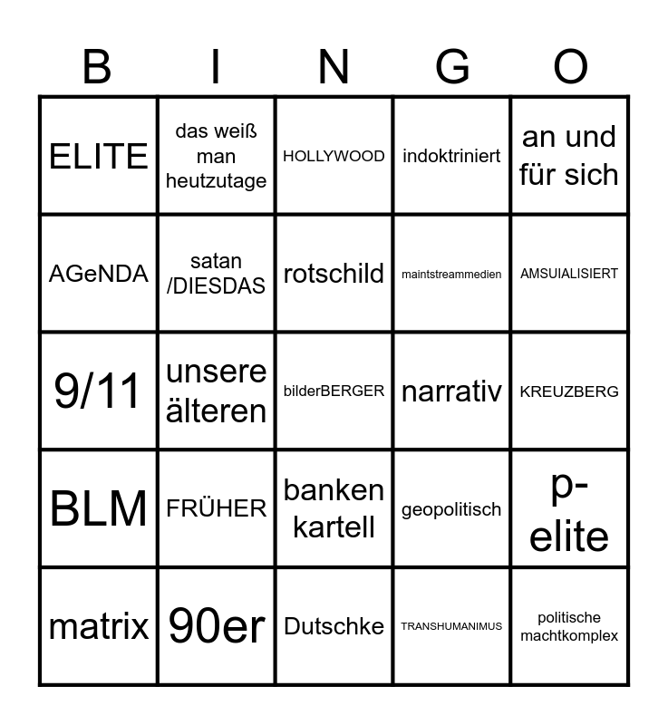 This bingo card has a free space and 24 words: FRÜHER, 90er, rotschild, matrix, an und für sich, ELITE, AGeNDA, das weiß man heutzutage, narrativ, banken kartell, maintstreammedien, 9/11, geopolitisch, p-elite, satan /DIESDAS, TRANSHUMANIMUS, KREUZBERG, HOLLYWOOD, AMSUIALISIERT, unsere älteren, politische machtkomplex, BLM, indoktriniert and Dutschke.