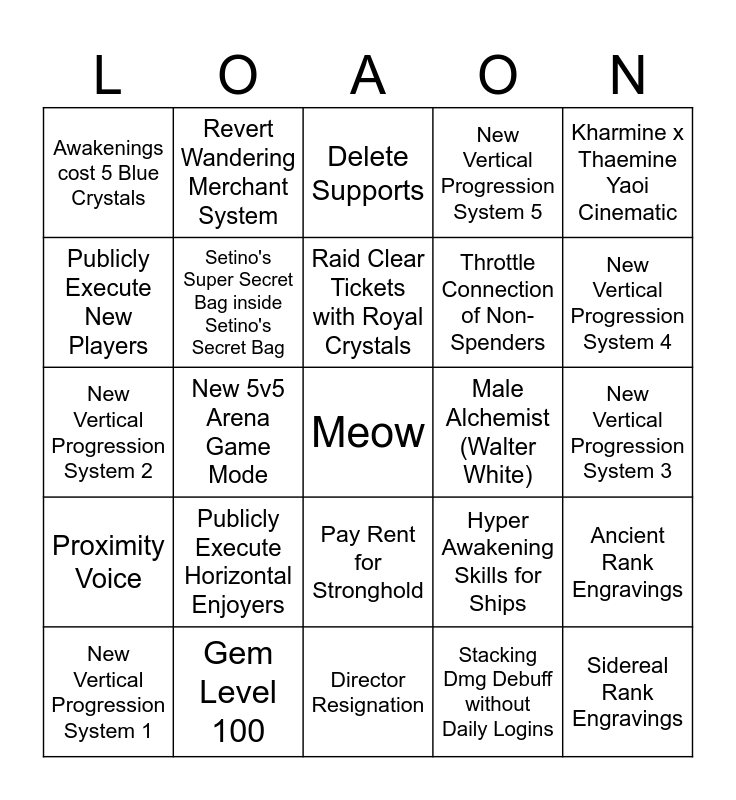 This bingo card has a free space and 24 words: Publicly Execute Horizontal Enjoyers, Gem Level 100, Raid Clear Tickets with Royal Crystals, New Vertical Progression System 1, Kharmine x Thaemine Yaoi Cinematic, Awakenings cost 5 Blue Crystals, Publicly Execute New Players, Revert Wandering Merchant System, Male Alchemist (Walter White), Pay Rent for Stronghold, Throttle Connection of Non-Spenders, New Vertical Progression System 2, Hyper Awakening Skills for Ships, Ancient Rank Engravings, Setino's Super Secret Bag inside Setino's Secret Bag, Stacking Dmg Debuff without Daily Logins, New Vertical Progression System 3, Delete Supports, New Vertical Progression System 4, New 5v5 Arena Game Mode, Sidereal Rank Engravings, Proximity Voice, New Vertical Progression System 5 and Director Resignation.