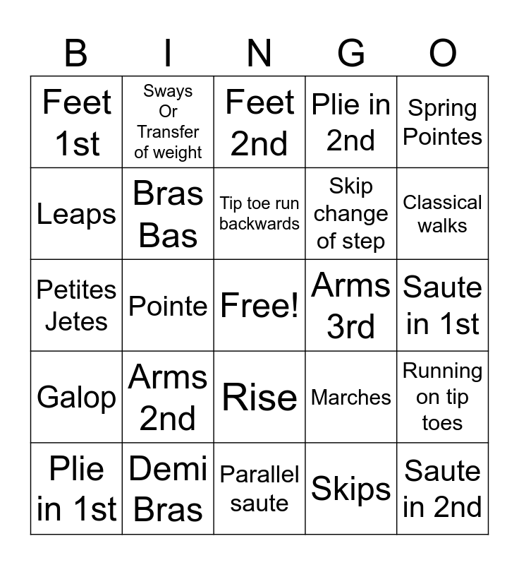 This bingo card has a free space and 29 words: Plie in 1st, Tendu, Pointe, Flex, Feet 1st, Feet 2nd, Bras Bas, Arms 2nd, Arms 3rd, Demi Bras, Saute in 1st, Saute in 2nd, Parallel saute, Skips, Classical walks, Tip toe turn, Rise, Galop, Spring Pointes, Petites Jetes, Marches, Spring Heels, Skip change of step, Leaps, Plie in 2nd, Sways Or Transfer of weight, Running on tip toes, Tip toe run backwards and Demi pointe.