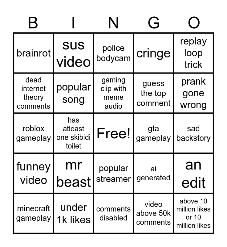 This bingo card has a free space and 24 words: minecraft gameplay, mr beast, gaming clip with meme audio, video above 50k comments, replay loop trick, brainrot, sus video, police bodycam, gta gameplay, sad backstory, roblox gameplay, popular song, ai generated, an edit, dead internet theory comments, under 1k likes, comments disabled, cringe, prank gone wrong, funney video, has atleast one skibidi toilet, popular streamer, guess the top comment and above 10 million likes or 10 million likes.