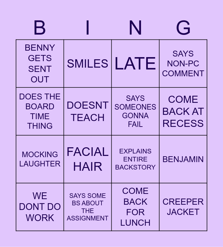 This bingo card has 16 words: WE DONT DO WORK, SAYS SOME BS ABOUT THE ASSIGNMENT, LATE, SAYS NON-PC COMMENT, DOES THE BOARD TIME THING, SMILES, EXPLAINS ENTIRE BACKSTORY, BENJAMIN, BENNY GETS SENT OUT, DOESNT TEACH, COME BACK FOR LUNCH, COME BACK AT RECESS, MOCKING LAUGHTER, FACIAL HAIR, SAYS SOMEONES GONNA FAIL and CREEPER JACKET.