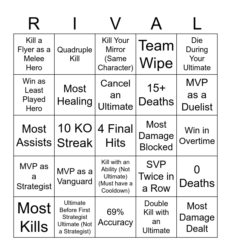 This bingo card has a free space and 24 words: MVP as a Vanguard, Ultimate Before First Strategist Ultimate (Not a Strategist), Cancel an Ultimate, Most Kills, Die During Your Ultimate, Kill a Flyer as a Melee Hero, Win as Least Played Hero, Quadruple Kill, Most Damage Blocked, Kill with an Ability (Not Ultimate) (Must have a Cooldown), 15+ Deaths, Most Assists, SVP Twice in a Row, 0 Deaths, Most Healing, Double Kill with an Ultimate, Win in Overtime, Kill Your Mirror (Same Character), MVP as a Duelist, 10 KO Streak, Most Damage Dealt, MVP as a Strategist, Team Wipe and 69% Accuracy.