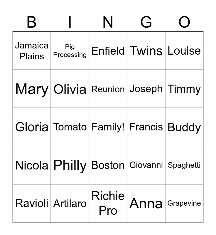 This bingo card has a free space and 29 words: Ravioli, Risotto, Tomato, Nicholas, Jamaica Plains, Enfield, Olivia, Philly, Francis, Artilaro, Buddy, Grapevine, Richie Pro, Anna, Timmy, Philip R., Boston, Nicola, Louise, Gloria, Giovanni, Antonina, Joseph, Mary, Twins, Pig Processing, Spaghetti, Reunion and LOVE.