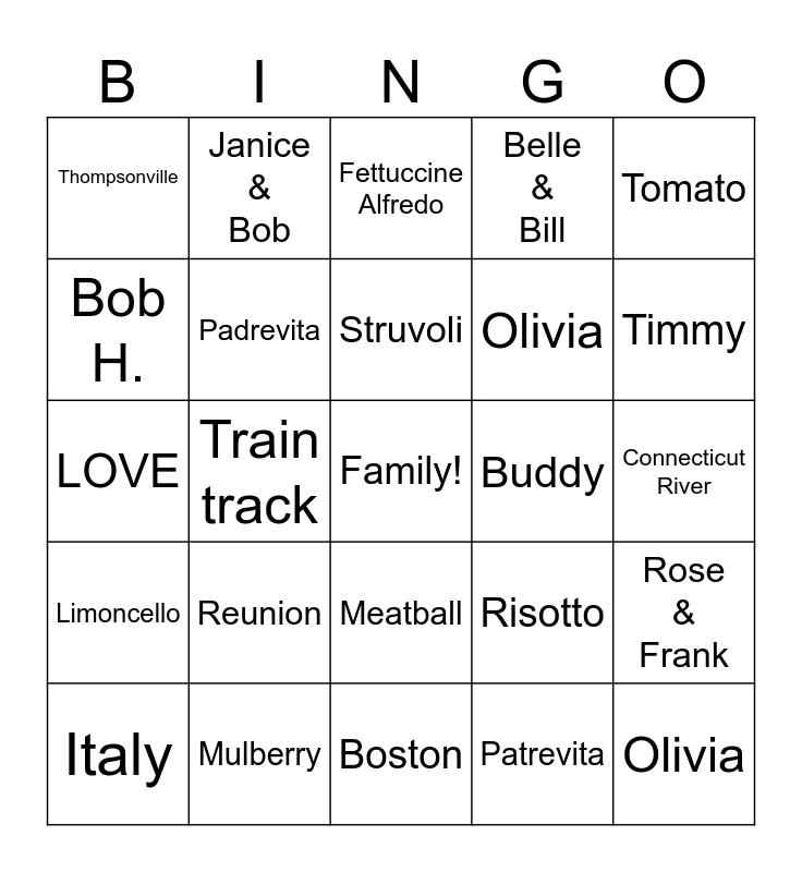 This bingo card has a free space and 29 words: Italy, Enfield, Train track, Richie Pro, Thompsonville, Fettuccine Alfredo, Padrevita, Reunion, Buddy, Mulberry, Connecticut River, Olivia, Boston, Patrevita, Timmy, Philly, Meatball, Limoncello, Tomato, LOVE, Risotto, South River St., Olivia, Bob H., Belle & Bill, Janice & Bob, Rose & Frank, Struvoli and Manesta.