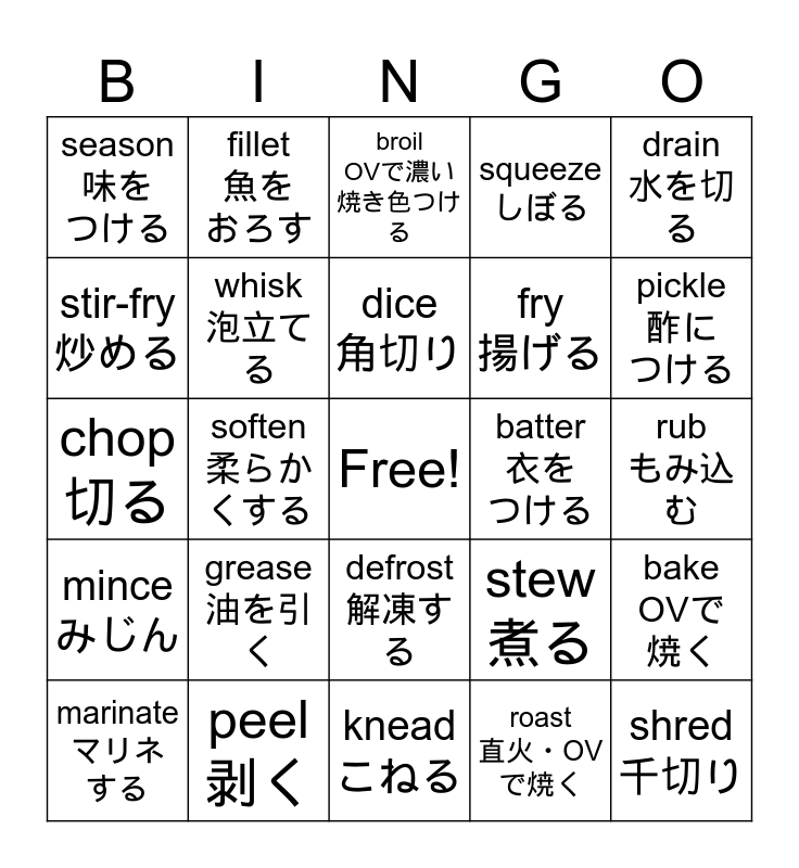 This bingo card has a free space and 40 words: cut 切る, chop 切る, beat 卵を 混ぜる, whisk 泡立てる, peel 剥く, defrost 解凍する, dice 角切り, grate すりおろす, drain 水を切る, mince みじん, soften 柔らかくする, squeeze しぼる, shred 千切り, rub もみ込む, batter 衣を つける, grease 油を引く, preheat 予熱する, season 味を つける, grill 直火で 焼く, broil OVで濃い焼き色つける, bake OVで 焼く, roast 直火・OVで焼く, fry 揚げる, stir-fry 炒める, brown, boil ゆでる, simmer 煮る, steam 蒸す, add 加える, mash つぶす, stuff 詰める, marinate マリネ する, garnish 飾る, stew 煮る, pickle 酢に つける, knead こねる, combine 合わせる, crack 卵を割る, fillet 魚を おろす and beat 卵を 混ぜる.