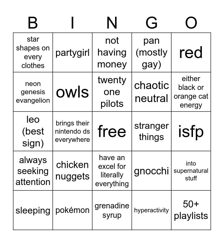 This bingo card has a free space and 24 words: chicken nuggets, pokémon, twenty one pilots, sleeping, red, star shapes on every clothes, neon genesis evangelion, partygirl, stranger things, have an excel for literally everything, chaotic neutral, leo (best sign), gnocchi, into supernatural stuff, owls, hyperactivity, isfp, not having money, either black or orange cat energy, brings their nintendo ds everywhere, 50+ playlists, always seeking attention, pan (mostly gay) and grenadine syrup.