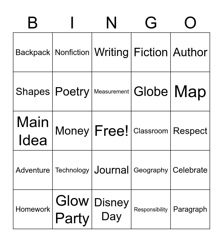 This bingo card has a free space and 77 words: Math, Reading, Writing, Spelling, Phonics, Science, Social Studies, Addition, Subtraction, Multiplication, Array, Place Value, Measurement, Shapes, Time, Money, Story, Paragraph, Sentence, Author, Character, Main Idea, Poetry, Nonfiction, Fiction, Experiment, Observe, Predict, Compare, Contrast, Community, Citizenship, History, Geography, Map, Globe, Continents, Oceans, Respect, Responsibility, Kindness, Honesty, Friendship, Teamwork, Recess, Lunch, Homework, Backpack, Pencil, Eraser, Notebook, Journal, Desk, Chair, Teacher, Student, Library, Art, Music, P.E., Technology, Computer, Chromebook, Calendar, Schedule, Field Trip, Assembly, Classroom, Rules, Cleanup, Partner, Celebrate, Adventure, Glow Party, Camp Day, Disney Day and National Parks.