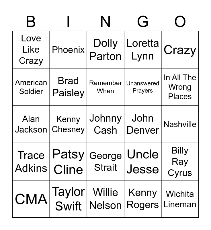 This bingo card has 43 words: Arkansas, Johnny Cash, Dollywood, CMA, 1925, Kenny Rogers, Dolly Parton, Reba McEntire, Crazy, Taylor Swift, Loretta Lynn, John Denver, George Strait, Patsy Cline, Tim McGraw, Willie Nelson, The Voice, Alan Jackson, Nancy Sinatra, In All The Wrong Places, Phoenix, Virginia, Jeannie C Riley, Love Like Crazy, Brooks and Dunn, Nashville, Gene Autry, Garth Brooks, Uncle Jesse, Trace Adkins, Faith Hill, Billy Ray Cyrus, Carrie Underwood, Kenny Chesney, I Cross My Heart, A Boy Named Sue, Wichita Lineman, Remember When, American Soldier, Unanswered Prayers, You're Gonna Miss This, Brad Paisley and Where I Get Where I'm Going.