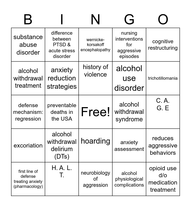 This bingo card has a free space and 24 words: alcohol withdrawal delirium (DTs), H. A. L. T., history of violence, first line of defense treating anxiety (pharmacology), cognitive restructuring, substance abuse disorder, alcohol withdrawal treatment, difference between PTSD & acute stress disorder, alcohol withdrawal syndrome, hoarding, alcohol use disorder, defense mechanism: regression, anxiety assessment, reduces aggressive behaviors, anxiety reduction strategies, alcohol physiological complications, C. A. G. E, wernicke- korsakoff encephalopathy, trichotillomania, preventable deaths in the USA, opioid use d/o medication treatment, excoriation, nursing interventions for aggressive episodes and neurobiology of aggression.
