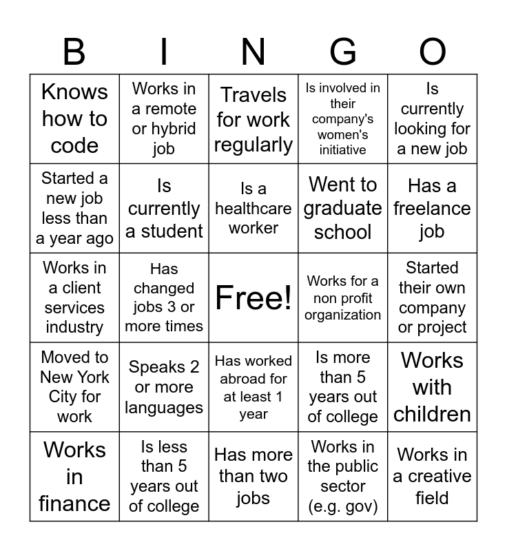 This bingo card has a free space and 24 words: Speaks 2 or more languages, Is less than 5 years out of college, Is a healthcare worker, Works in finance, Is currently looking for a new job, Knows how to code, Started a new job less than a year ago, Works in a remote or hybrid job, Works for a non profit organization, Has worked abroad for at least 1 year, Went to graduate school, Works in a client services industry, Is more than 5 years out of college, Works with children, Is currently a student, Works in the public sector (e.g. gov), Started their own company or project, Travels for work regularly, Has a freelance job, Has changed jobs 3 or more times, Works in a creative field, Moved to New York City for work, Is involved in their company's women's initiative and Has more than two jobs.