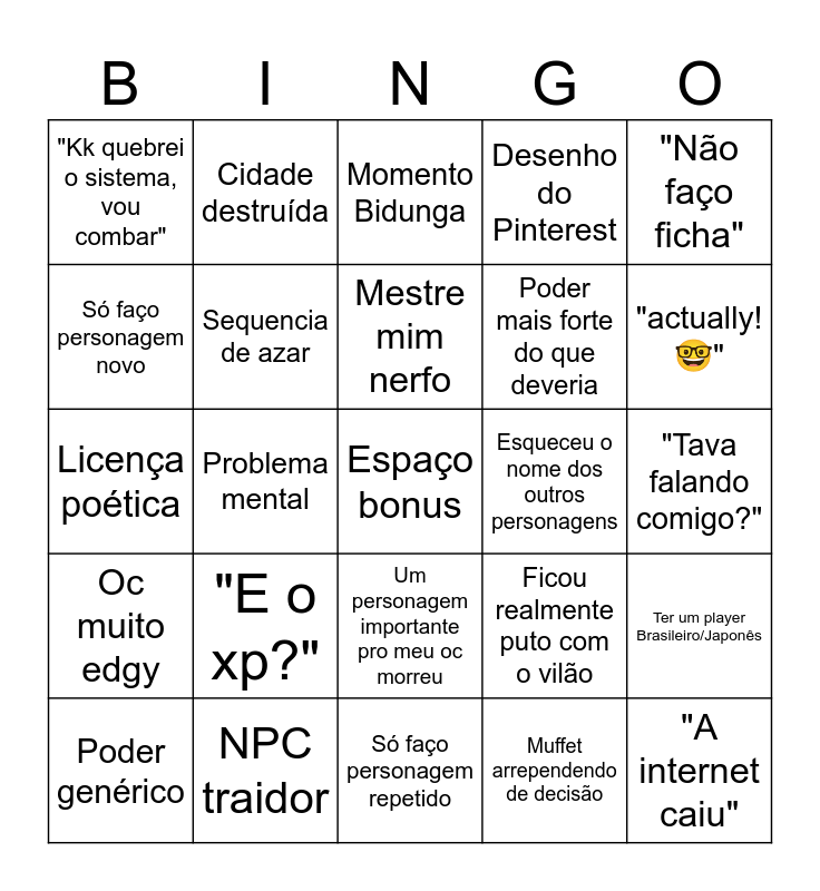 This bingo card has a free space and 39 words: "Tava falando mutado", Natural 20, Natural 1, Sequencia de azar, Poder genérico, Um personagem importante pro meu oc morreu, Mestre mim nerfo, Muito trauma, "Não faço ficha", Oc muito edgy, Problema mental, Desenho do Pinterest, "A internet caiu", "Tava falando comigo?", Esqueceu o nome dos outros personagens, "E o xp?", Casalzinho, "Kk quebrei o sistema, vou combar", Já chorou por rpg, Ficou realmente puto com o vilão, Só faço personagem novo, Só faço personagem repetido, Poder mais forte do que deveria, "actually! 🤓", Personagem irritante, Decisão Pecto, Personagem carregado pelo poder, Cultista redimido, Referências a outros rpgs, Cidade destruída, Alguém perder alguma parte do corpo, Momento +18, Momento Bidunga, NPC traidor, Muffet arrependendo de decisão, Rivalidade entre personagens, Ter um player Brasileiro/Japonês, Licença poética and Os três mosqueteiros.