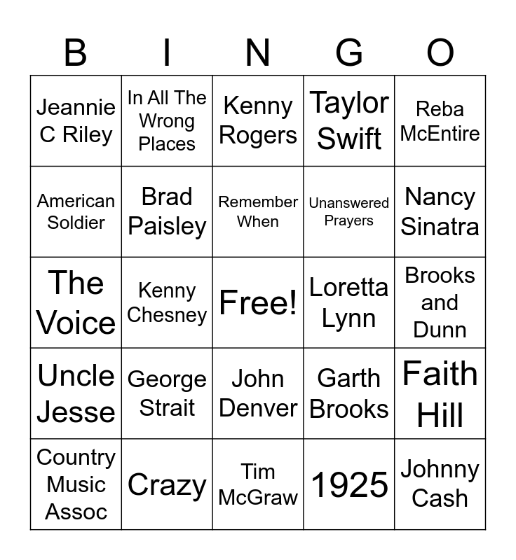 This bingo card has a free space and 44 words: Arkansas, Johnny Cash, Dollywood, Country Music Assoc, Tennessee, 1925, Kenny Rogers, Dolly Parton, Reba McEntire, Crazy, Taylor Swift, Loretta Lynn, John Denver, George Strait, Patsy Cline, Tim McGraw, Willie Nelson, The Voice, Alan Jackson, Nancy Sinatra, In All The Wrong Places, Phoenix, Virginia, Jeannie C Riley, Love Like Crazy, Brooks and Dunn, Nashville, Gene Autry, Garth Brooks, Uncle Jesse, Trace Adkins, Faith Hill, Billy Ray Cyrus, Carrie Underwood, Kenny Chesney, I Cross My Heart, A Boy Named Sue, Wichita Lineman, Remember When, American Soldier, Unanswered Prayers, You're Gonna Miss This, Brad Paisley and Where I Get Where I'm Going.