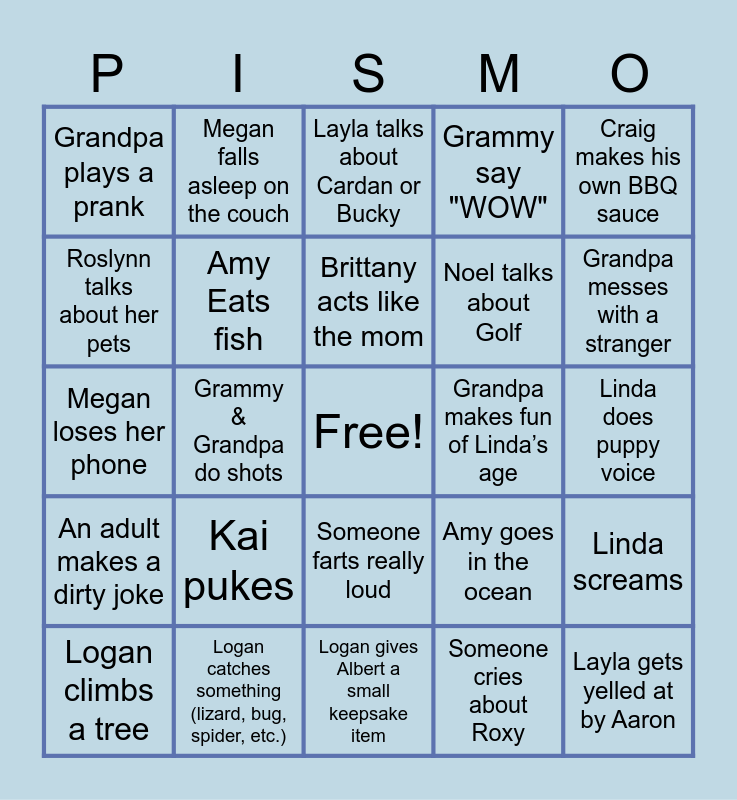 This bingo card has a free space and 36 words: Aaron talks about Trader Joes, Albert talks about Italy, Albert wins a game of Jackbox, Amy Eats fish, Amy goes in the ocean, An adult makes a dirty joke, Brittany acts like the mom, Brittany says "Girlfriend", Craig makes his own BBQ sauce, Craig shows people videos on his phone, Grammy & Grandpa do shots, Grammy say "WOW", Grammy takes the kids shopping, Grandpa makes fun of Linda’s age, Grandpa messes with a stranger, Grandpa plays a prank, Kai cries, Kai pukes, Layla gets yelled at by Aaron, Layla talks about Cardan or Bucky, Linda does puppy voice, Linda screams, Logan catches something (lizard, bug, spider, etc.), Logan climbs a tree, Logan gives Albert a small keepsake item, Megan falls asleep on the couch, Megan loses her phone, Noel places/has a sports bet, Noel talks about Golf, Roslynn talks about her pets, Shelby asks everyone to play mafia, Shelby needs a band aid, Someone cries about Roxy, Someone farts really loud, The guys play poker and Roslynn talks about riding her horse.