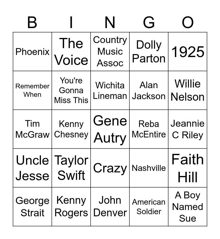 This bingo card has 44 words: Arkansas, Gene Autry, Johnny Cash, George Strait, Dollywood, American Soldier, Country Music Assoc, Tennessee, 1925, Kenny Rogers, Dolly Parton, Reba McEntire, Crazy, Taylor Swift, Loretta Lynn, John Denver, Patsy Cline, Tim McGraw, Brad Paisley, Willie Nelson, The Voice, Nancy Sinatra, In All The Wrong Places, Phoenix, Virginia, Jeannie C Riley, Love Like Crazy, Brooks and Dunn, Nashville, Uncle Jesse, Trace Adkins, Faith Hill, Billy Ray Cyrus, Carrie Underwood, Kenny Chesney, I Cross My Heart, Garth Brooks, A Boy Named Sue, Wichita Lineman, Remember When, Alan Jackson, Unanswered Prayers, You're Gonna Miss This and Where I Get Where I'm Going.
