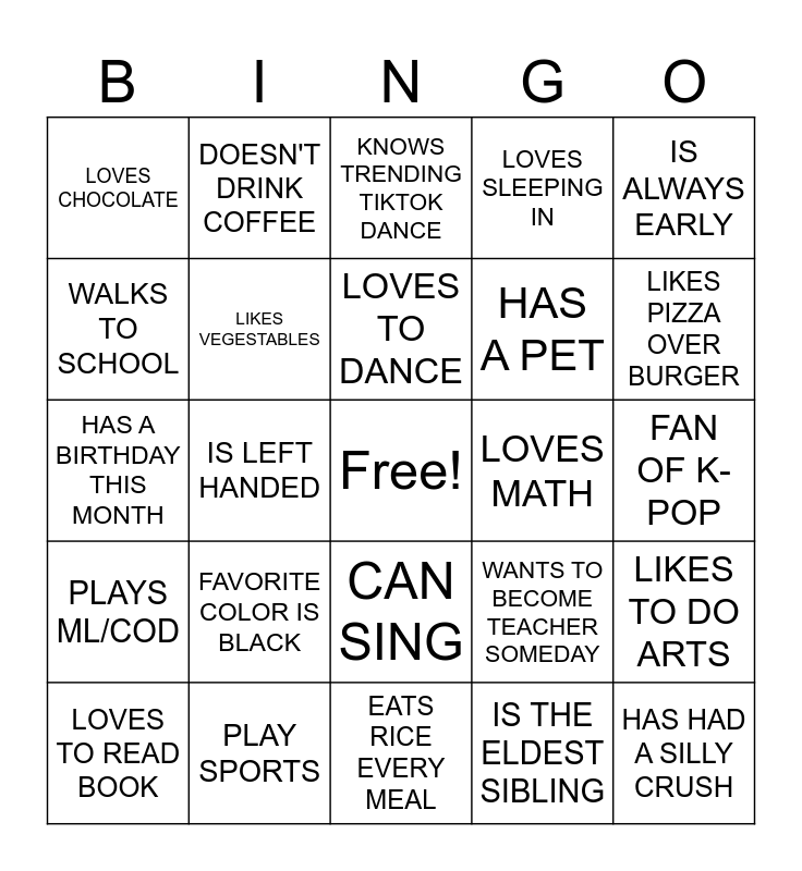 This bingo card has a free space and 24 words: FAVORITE COLOR IS BLACK, PLAY SPORTS, LOVES TO DANCE, LOVES TO READ BOOK, IS ALWAYS EARLY, LOVES CHOCOLATE, WALKS TO SCHOOL, DOESN'T DRINK COFFEE, LOVES MATH, CAN SING, HAS A PET, HAS A BIRTHDAY THIS MONTH, WANTS TO BECOME TEACHER SOMEDAY, LIKES TO DO ARTS, LIKES VEGESTABLES, IS THE ELDEST SIBLING, FAN OF K-POP, KNOWS TRENDING TIKTOK DANCE, LIKES PIZZA OVER BURGER, IS LEFT HANDED, HAS HAD A SILLY CRUSH, PLAYS ML/COD, LOVES SLEEPING IN and EATS RICE EVERY MEAL.
