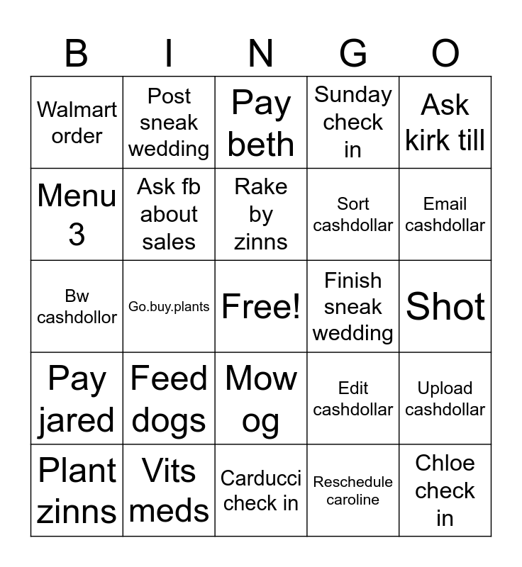 This bingo card has a free space and 24 words: Feed dogs, Vits meds, Rake by zinns, Plant zinns, Ask kirk till, Walmart order, Menu 3, Post sneak wedding, Finish sneak wedding, Mow og, Sort cashdollar, Bw cashdollor, Edit cashdollar, Upload cashdollar, Ask fb about sales, Reschedule caroline, Shot, Pay beth, Email cashdollar, Go.buy.plants, Chloe check in, Pay jared, Sunday check in and Carducci check in.