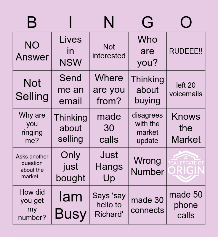 This bingo card has 1 images and 25 words: Just Hangs Up, made 30 connects, Where are you from?, Iam Busy, RUDEEE!!, NO Answer, Not Selling, Lives in NSW, Knows the Market, Wrong Number, Thinking about buying, Why are you ringing me?, How did you get my number?, Thinking about selling, Take me off the list, Who are you?, Asks another question about the market..., Not interested, made 30 calls, left 20 voicemails, Says 'say hello to Richard', disagrees with the market update, Only just bought, Send me an email and made 50 phone calls.