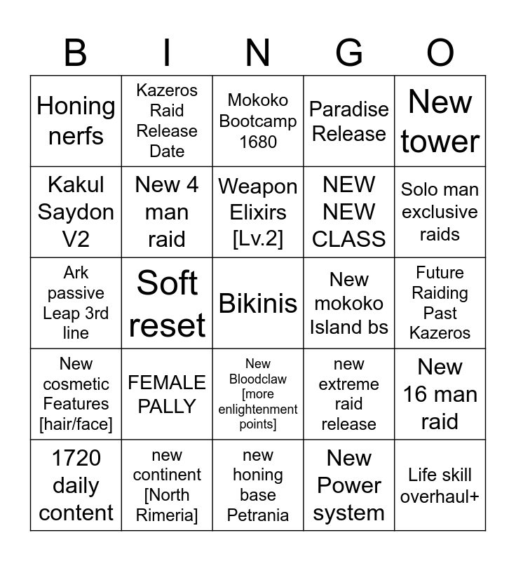 This bingo card has a free space and 24 words: FEMALE PALLY, new continent [North Rimeria], Weapon Elixirs [Lv.2], 1720 daily content, New tower, Honing nerfs, Kakul Saydon V2, Kazeros Raid Release Date, New mokoko Island bs, New Bloodclaw [more enlightenment points], NEW NEW CLASS, Ark passive Leap 3rd line, new extreme raid release, New 16 man raid, New 4 man raid, New Power system, Future Raiding Past Kazeros, Mokoko Bootcamp 1680, Solo man exclusive raids, Soft reset, Life skill overhaul+, New cosmetic Features [hair/face], Paradise Release and new honing base Petrania.