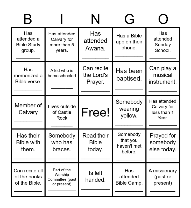 This bingo card has a free space and 26 words: Read their Bible today. _________, Has attended Bible Camp. __________, Can recite the Lord's Prayer. _________, Part of the Worship Committee (past or present) _____________, Has attended Sunday School. __________, Has attended a Bible Study group. _________, Has memorized a Bible verse. __________, Has attended Calvary for more than 5 years. ___________, Has attended Calvary for less than 1 Year. ___________, Somebody that you haven't met before. __________, Has been baptised. ________, Member of Calvary _________, Prayed for somebody else today. _________, Can recite all of the books of the Bible. __________, Lives outside of Castle Rock ________, Is a deputy _________, Has a Bible app on their phone. __________, Has their Bible with them. _________, Has attended Awana. ________, A missionary (past or present) _________, Can play a musical instrument. _________, Is left handed. _________, Somebody wearing yellow. _________, Somebody who has braces. _________, A kid who is homeschooled _________ and A kid younger than 10 __________.